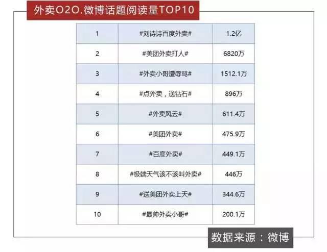 在新浪微博上,關于外賣O2O的話題高達幾百個,其中#劉詩詩百度外賣#以1.2億的閱讀量高居榜首。