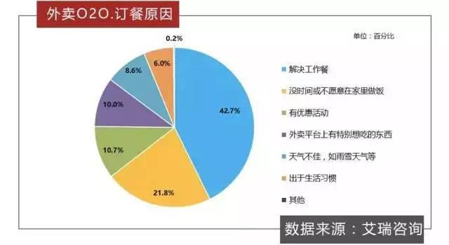而關于選擇外賣O2O的原因,42.7%的用戶點外賣是為了解決工作餐;21.8%的用戶是由于沒時間或不愿在家做飯;近一成的用戶是因為有優惠活動或外賣平臺上有特別想吃的餐品,8.6%的用戶是由于天氣不佳,也有6.0%的用戶表示外賣O2O已經成為了他們的生活習慣。