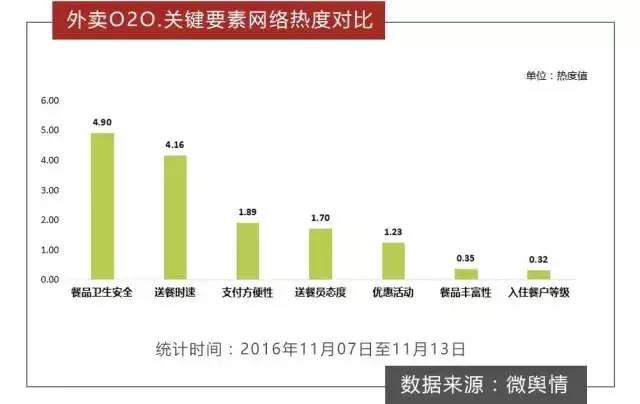 此外,根據數據統計,在外賣O2O的幾大要素中,“餐品衛生安全”和“送餐時速”的網絡熱度值相對較高,這也在側面說明網友對外賣O2O的“安全”和“時速”更為關注。